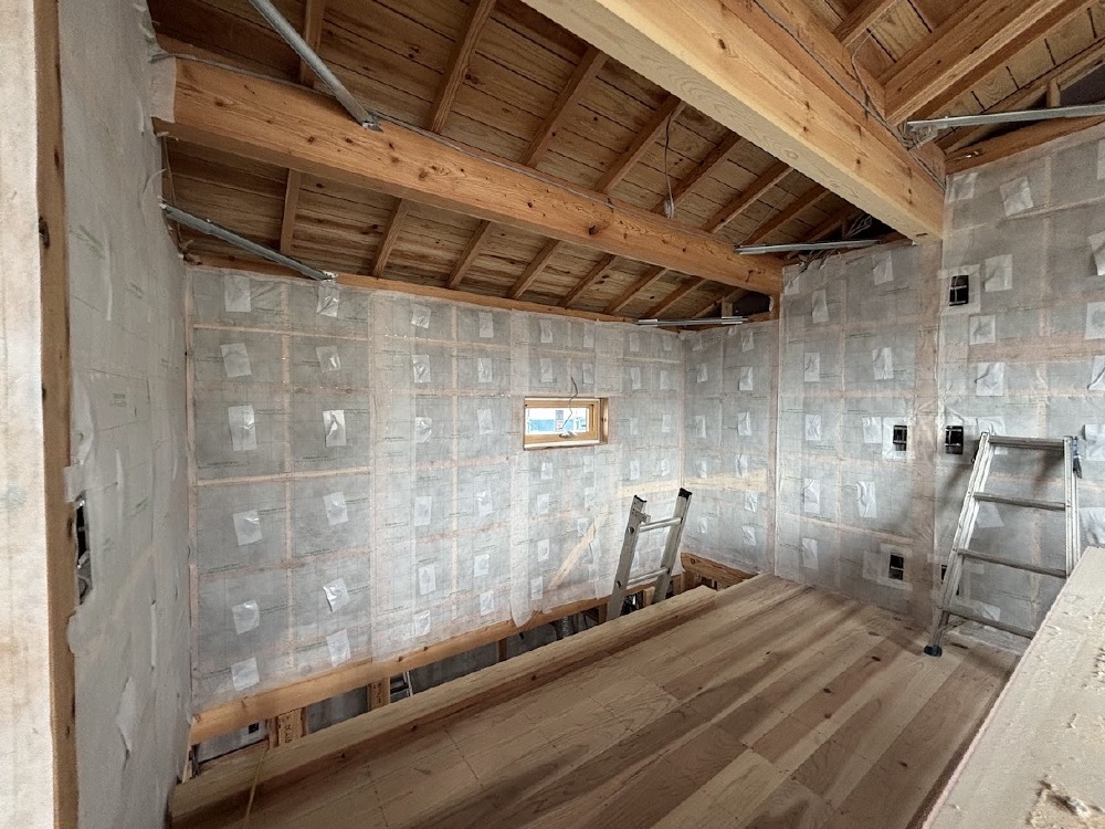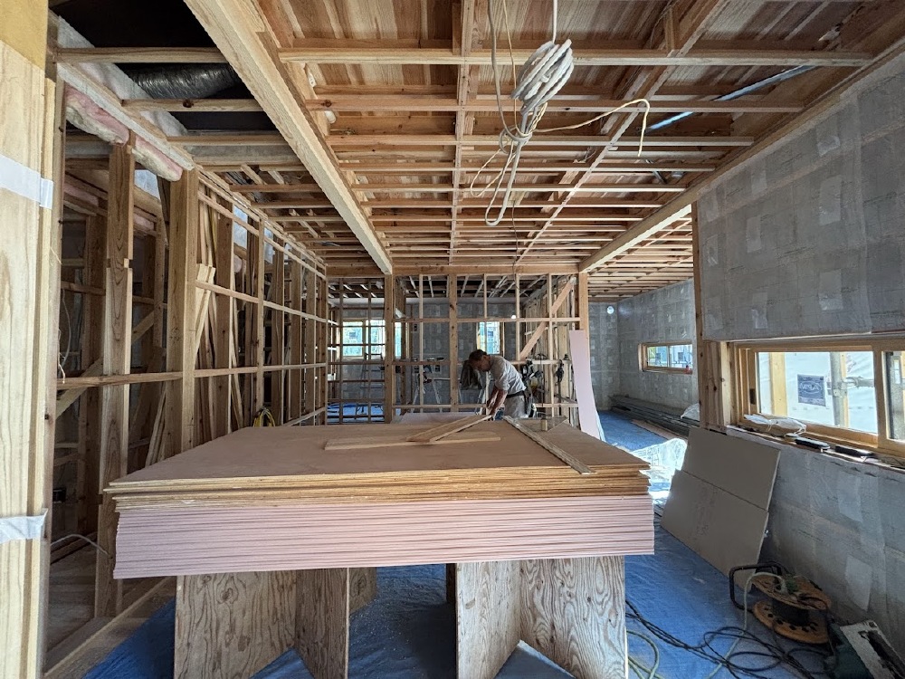 野縁が取り付けられました。天井のボード張り作業が行われています。