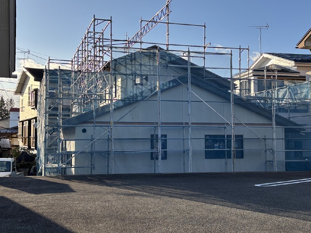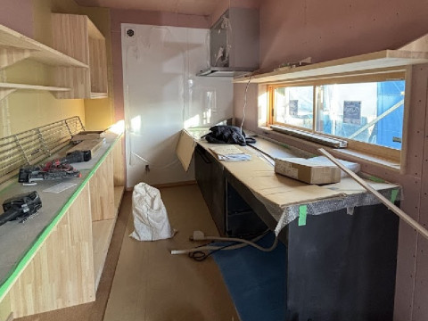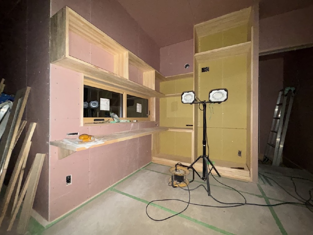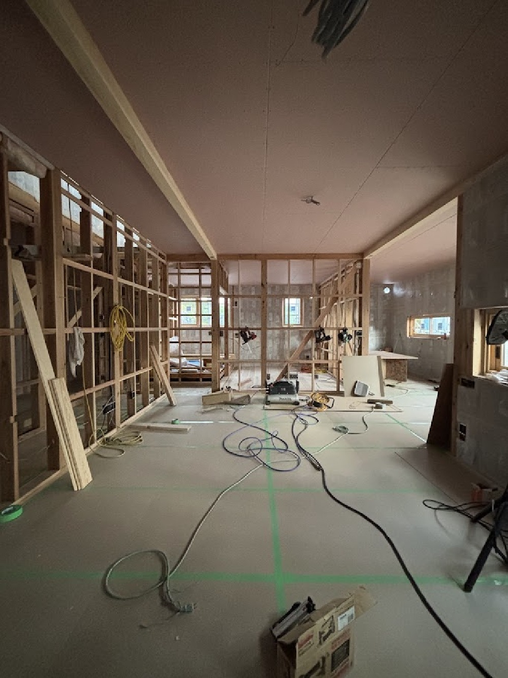 野縁が取り付けられました。天井のボード張り作業が行われています。