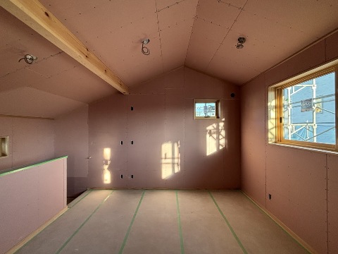 内部のボード張りはおよそ完了しました。これから建具枠の取り付けが行われます。