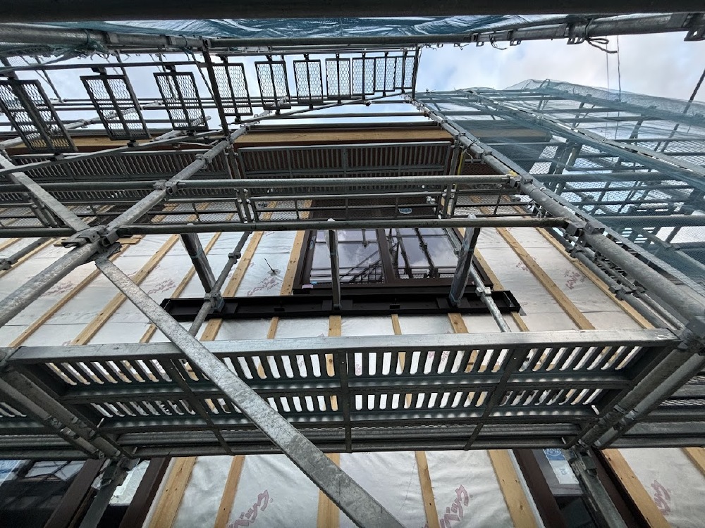 外部は軒天まで完了です。バルコニーのブラケットが設置されました。