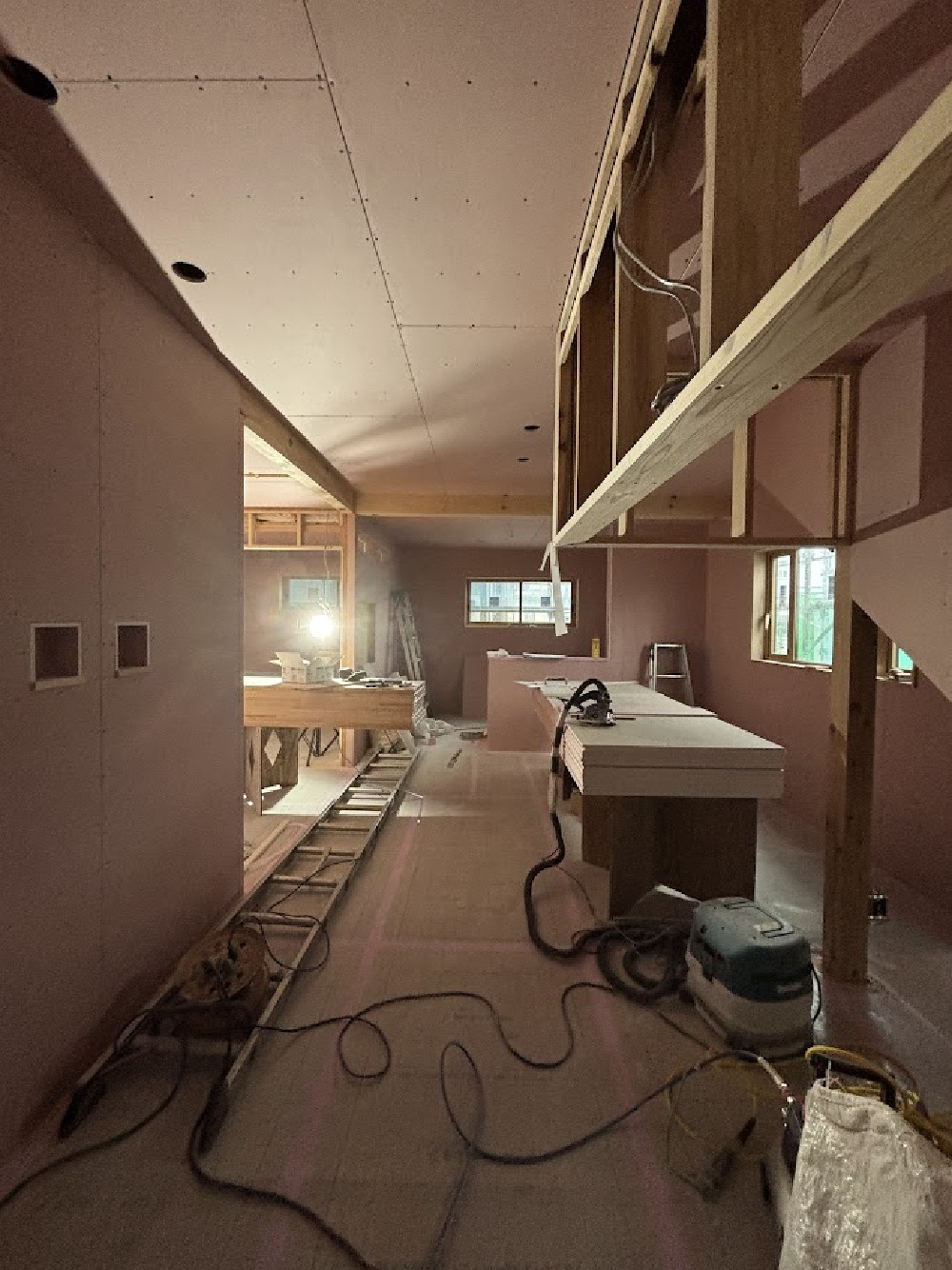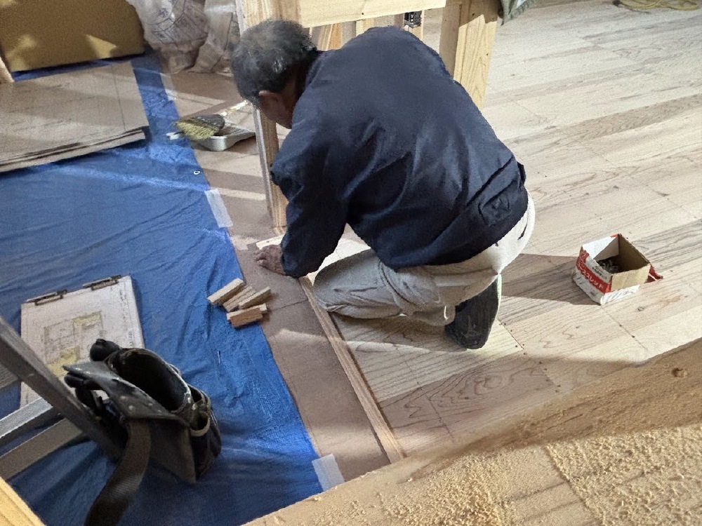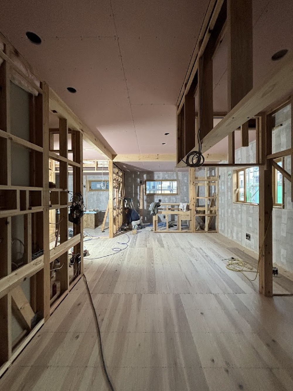 耐力面材と屋根葺きが行われています。床下地も施工が始まりました。