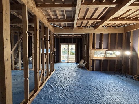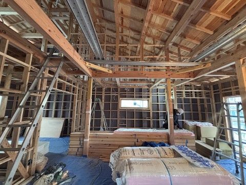 壁断熱が完了して、天井ボード張りが行われています。