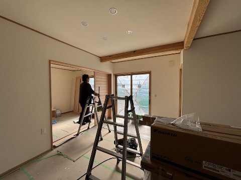 南からたっぷりと日の光が入る居間。内壁も仕上がるとより明るい空間となります。